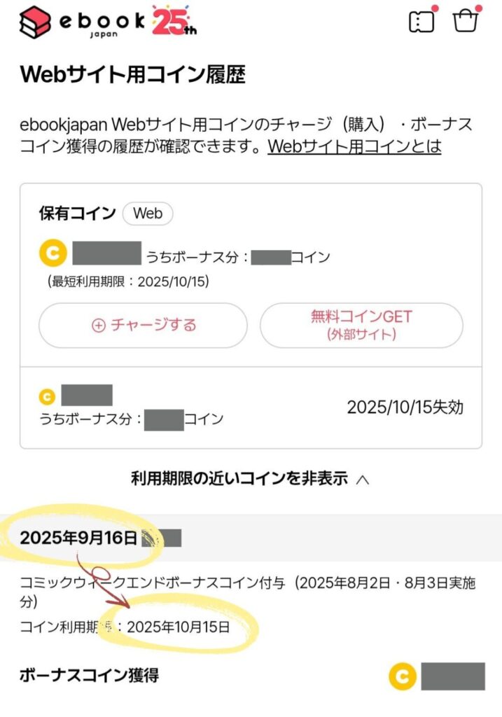 結論から言うと、Webサイト用ボーナスコインは購入から約1か月後に付与され、有効期限は付与から1か月と短いので注意が必要です!