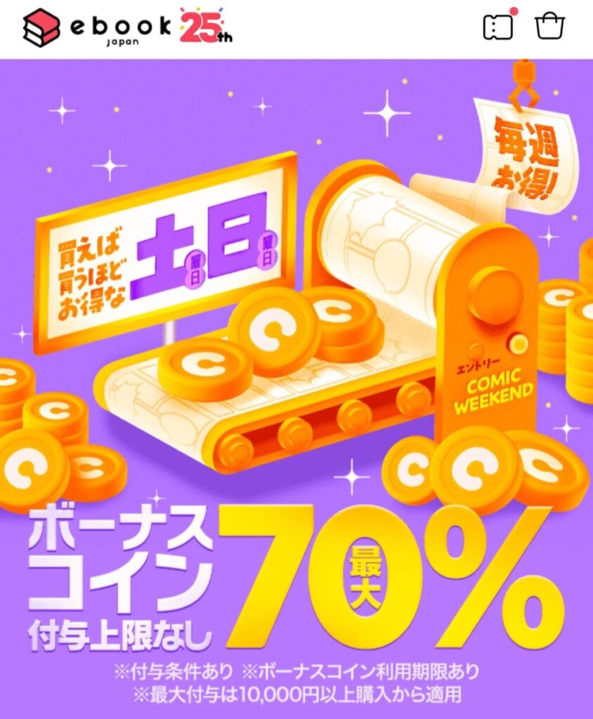 Webサイトでのみ使える、Webサイト用ボーナスコインが最大70%付与される、土・日のコミックウィークエンド!ボーナスコインには約1カ月の利用期限があるのでご注意を!