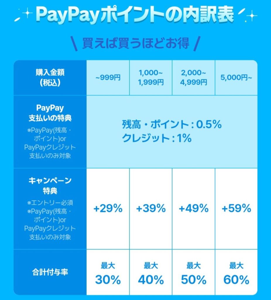 買えば買うほどお得になるシステムで、最大還元が受けられるのは5000円を超えてからですので、内訳表は下の画像を参考にしてみてください!